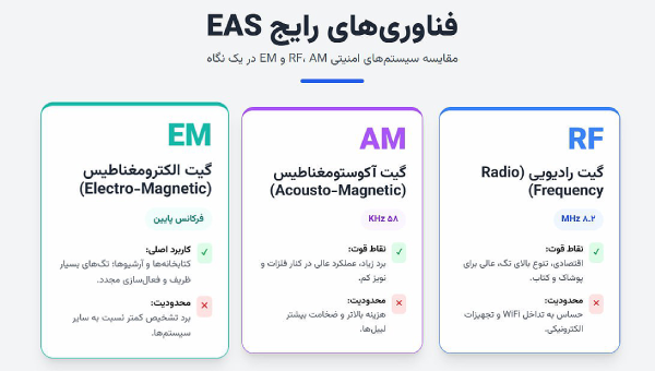 سه فناوری اصلی در سیستم امنیتی EAS وجود دارد که تفاوت آنها در نوع سیگنال، فرکانس کاری، نوع تگ و کاربرد است: