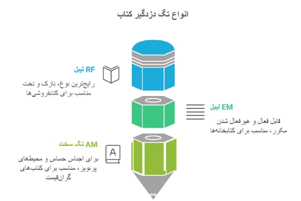 انواع تگ دزدگیر کتاب و لیبلهای مورد استفاده برای کتاب در سه گروه اصلیRF،EM و AM طبقهبندی میشوند که هر یک مزایا و محدودیتهای خاص خود را دارند.